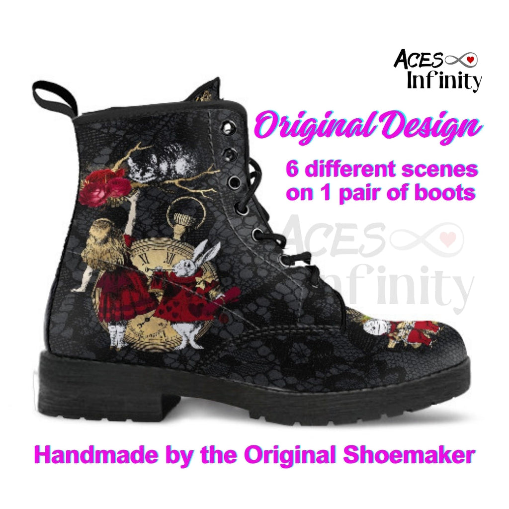 Combat Boots - Alice in Wonderland Gifts #301 Red Series (NEW), Black Lace Print | Birthday Gift Idea, Black Hipster Boots, Custom Shoes